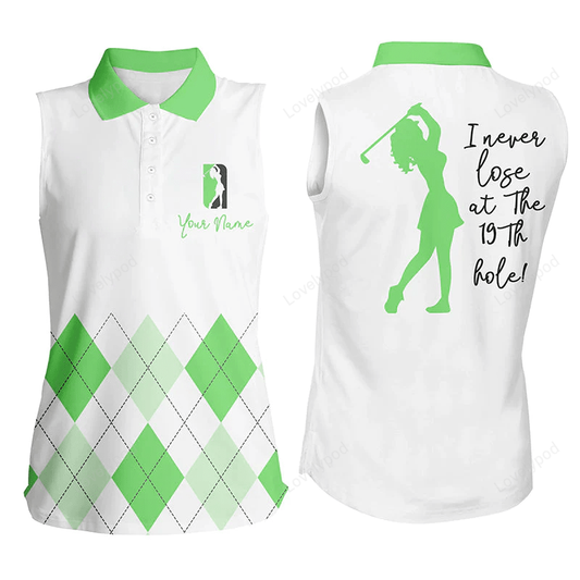 Women sleeveless polo shirt custom green argyle plaid golf top for ladie i never lose at the 19th hole GY0181