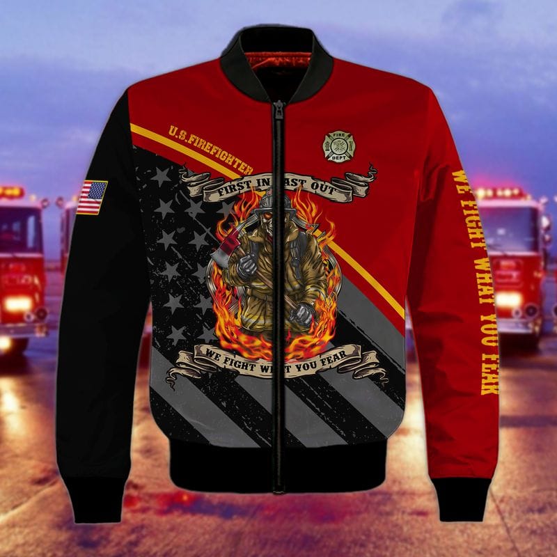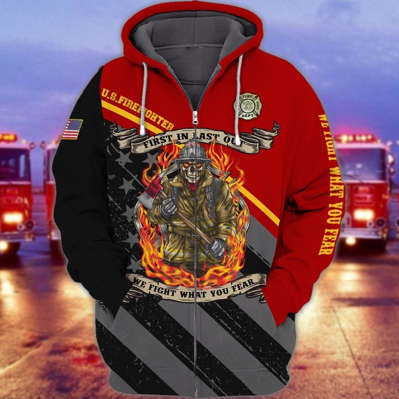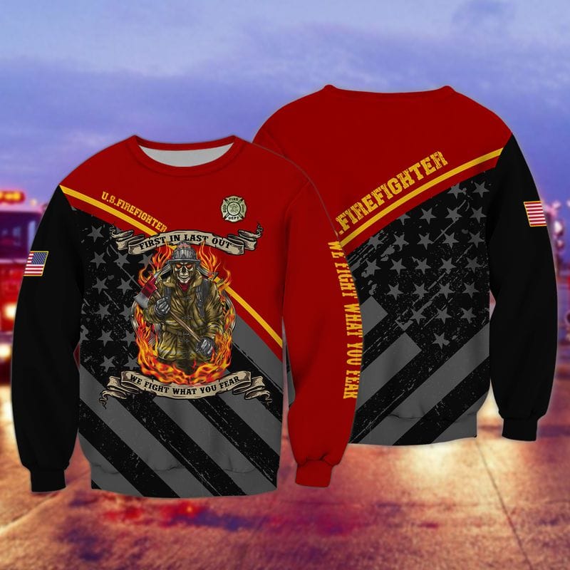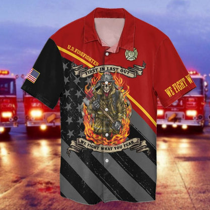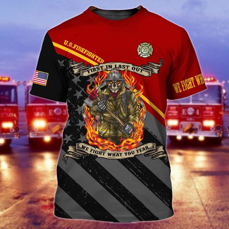 3D All Over Printed US Firefighter Flag Shirt, First In Last Out We Fight What You Fear, Skull Firefighter Shirt TO3275