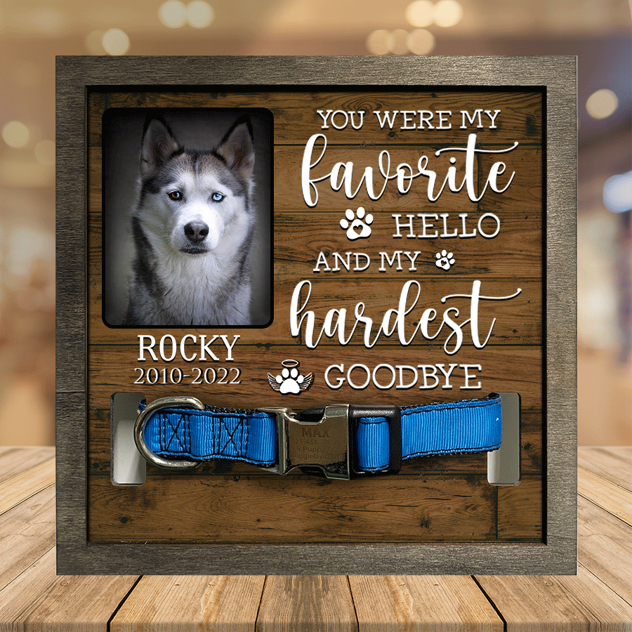 - Losing a pet is never easy. Having a beautiful keepsake to look at every day can help ease that grief a little bit. Customized with your pet's name and a spot for your favorite picture of them. The sign features a space to display their collar.