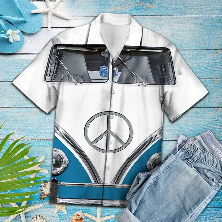 Awesome Blue And White Hippie Bus Pattern Hawaiian Shirt HO0192