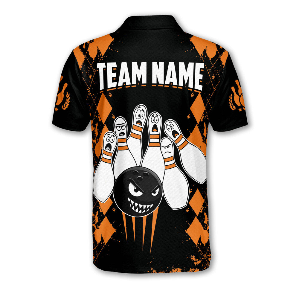 Custom Black And Orange Angry Ball Screaming Pins Bowling Men Polo Shirts, Custom Funny Bowling Team Shirts BM0341