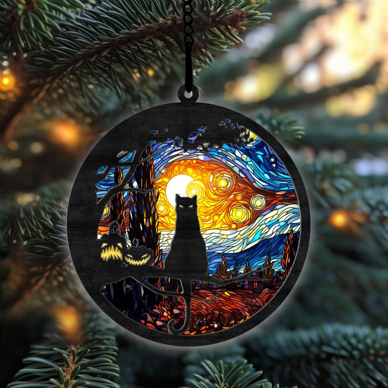 Black Cat Halloween Suncatcher, Cats Halloween Decoration, Spooky Black Cat Halloween Decor OA0186