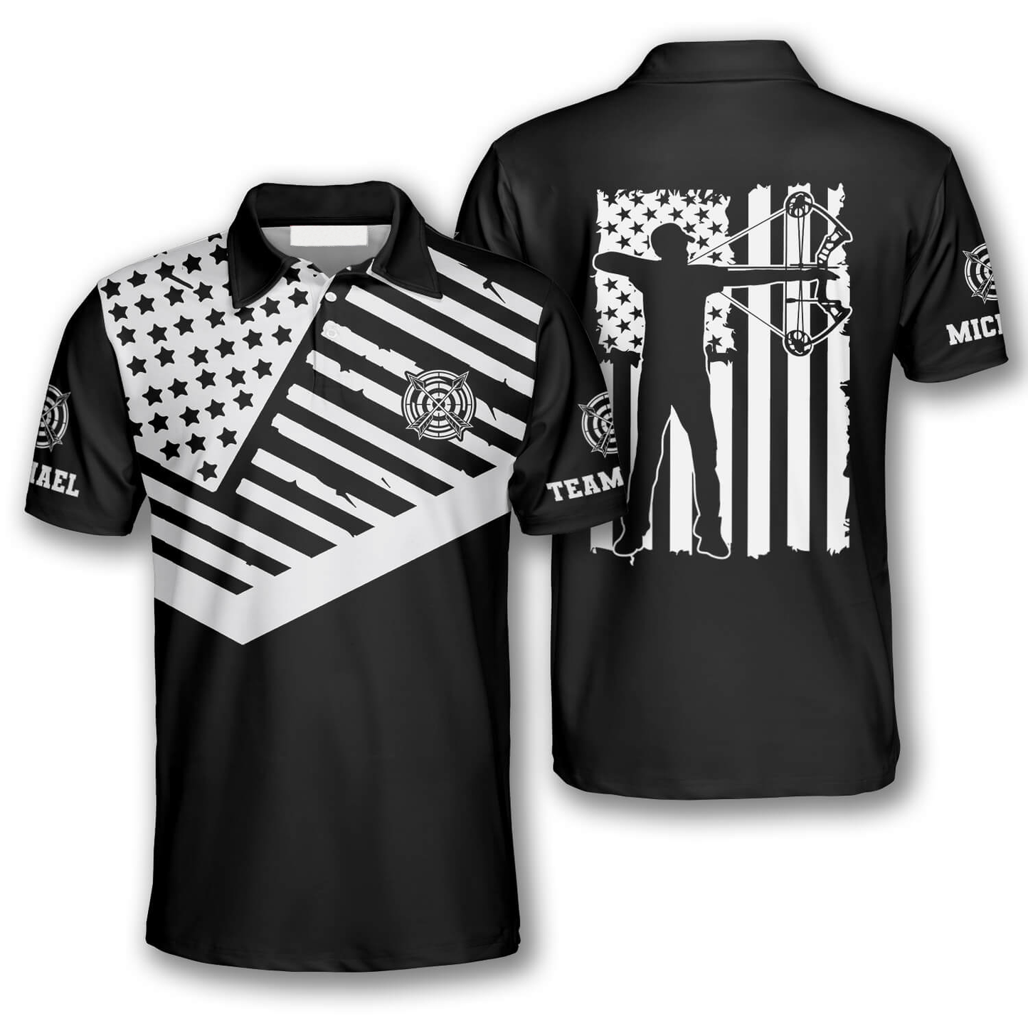 Black White American Flag Custom Archery Polo Shirts for Men, Flag American Archery Shirt AO0051
