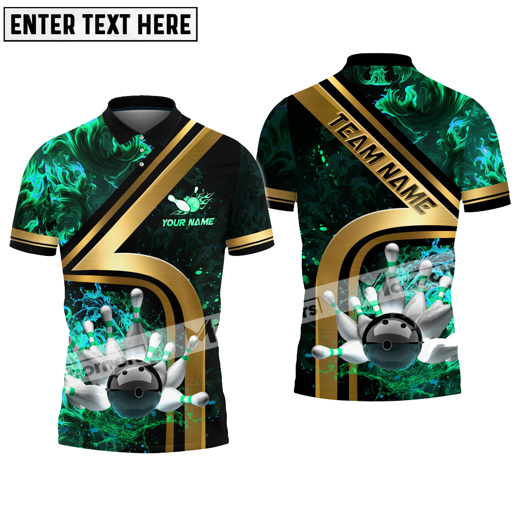 Bowling Ball & Pins Water And Flame Golden Multicolor Option Customized Name 3D Polo Shirt, Bowling Polo Shirt BO0418