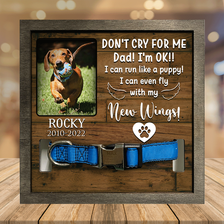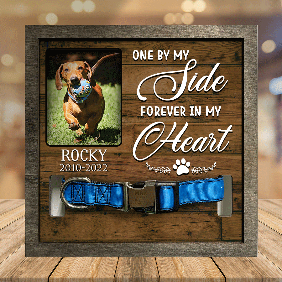 - Losing a pet is never easy. Having a beautiful keepsake to look at every day can help ease that grief a little bit. Customized with your pet's name and a spot for your favorite picture of them. The sign features a space to display their collar.