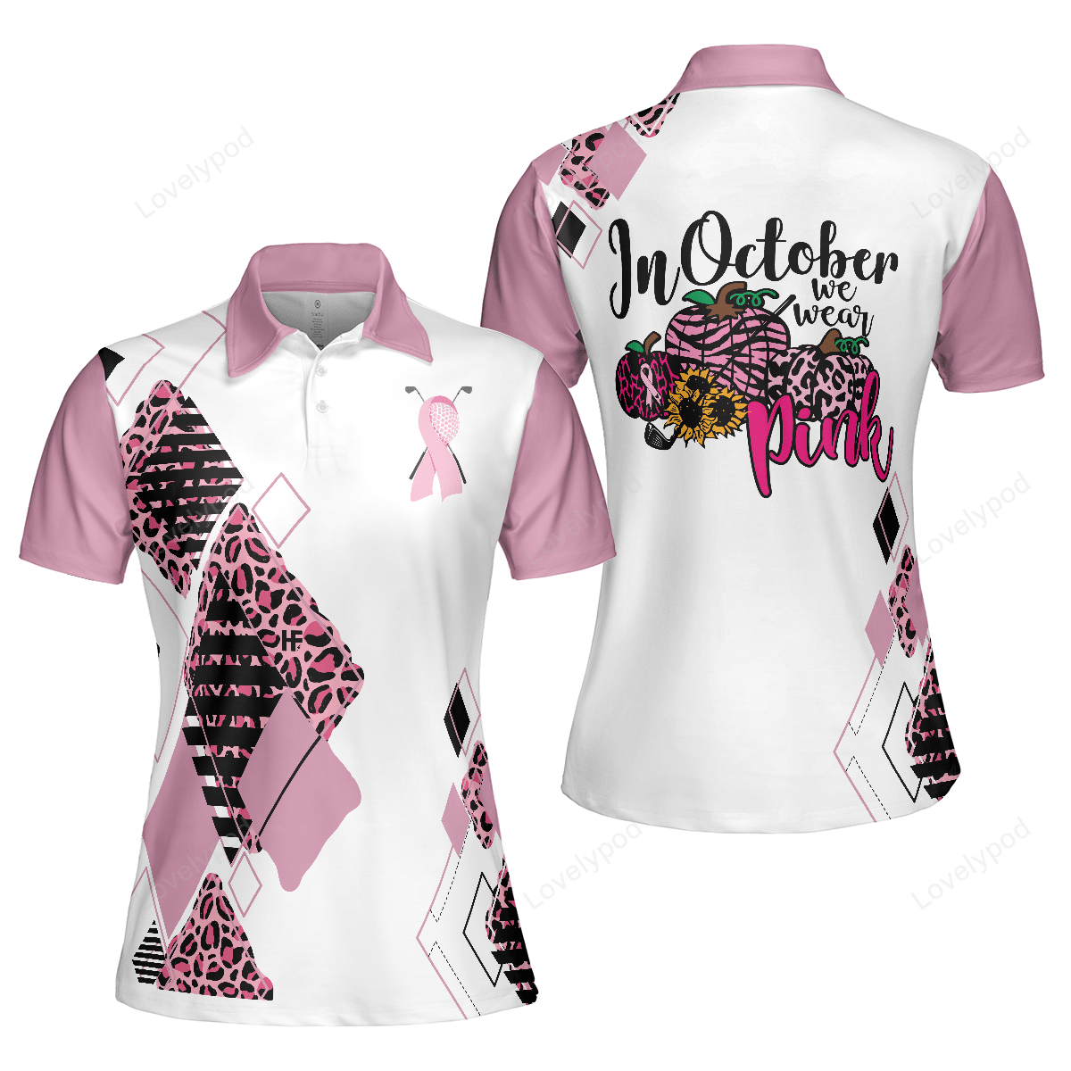 Golf girl in october we wear pink short sleeve women polo shirt, white and pink breast cancer awareness shirt GY0070
