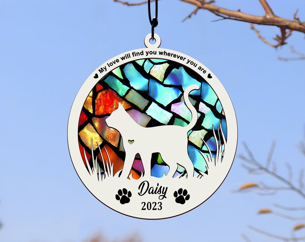 Handmade Custom Name Cat Decor With Memorial Card, Pet Memorial Suncatcher, Loss of Pet Sympathy Gift, Engraved Cat Lovers OA0222