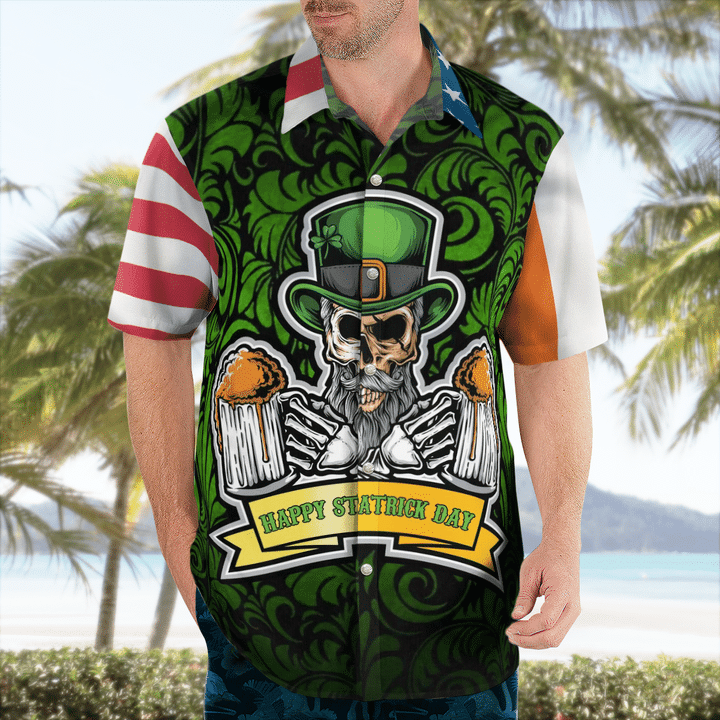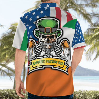 Hawaiian Aloha Shirts, American Irish Flag With Celtic Cross Drinking Skeleton Hawaii Shirt - Gift For Irish HO4453