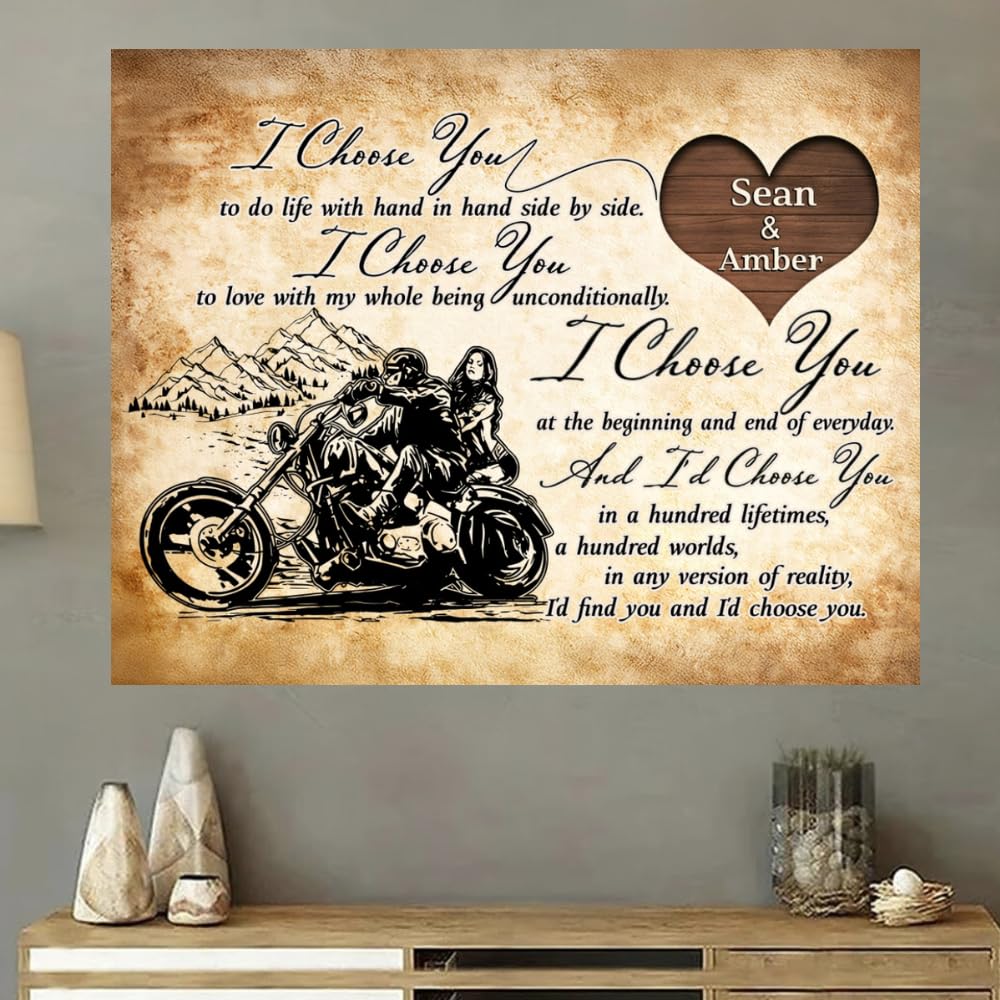 - Romantic & Unique Design: The powerful quote "I Choose You" paired with stunning custom artwork makes this romantic biker couple wall art a beautiful declaration of love.