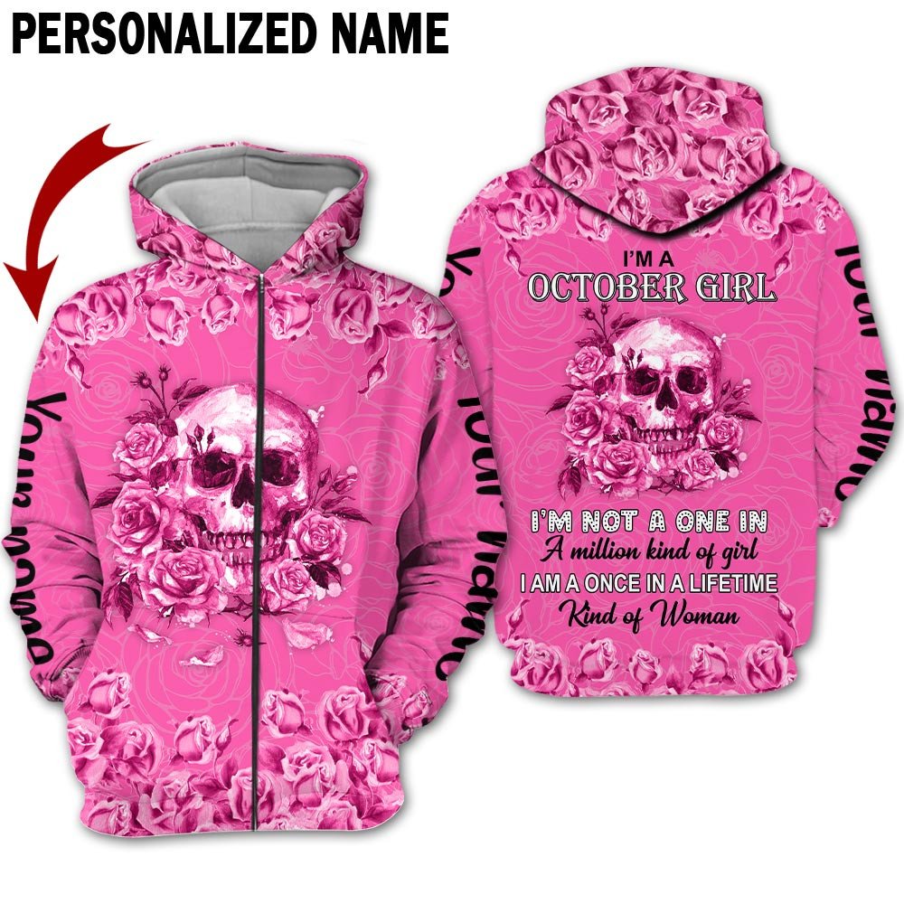 Personalized Name Birthday Outfit October Girl Skull Flower Pink Pink Birthday Shirt For Women TO2824