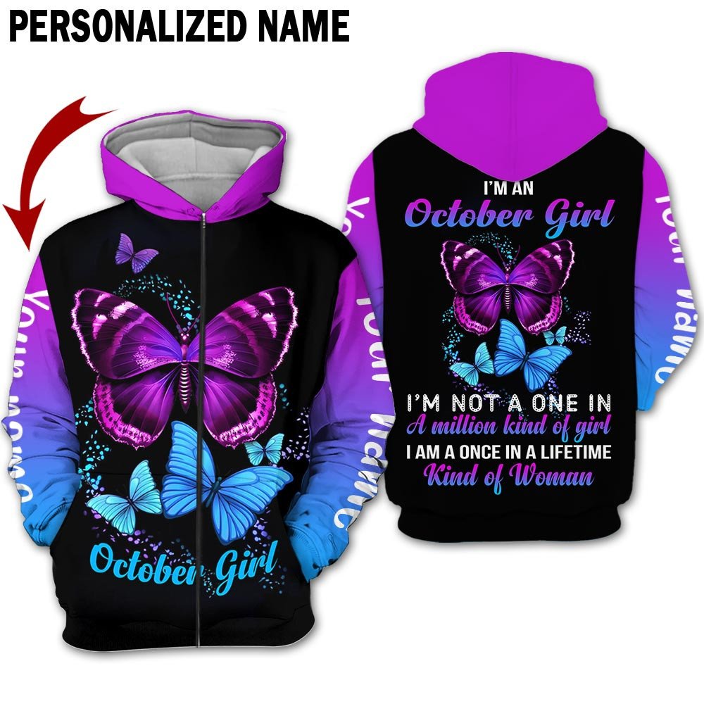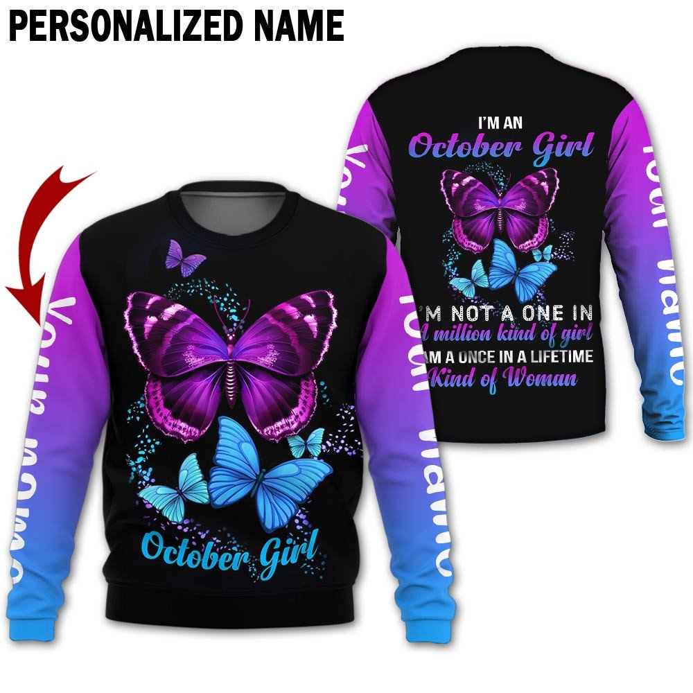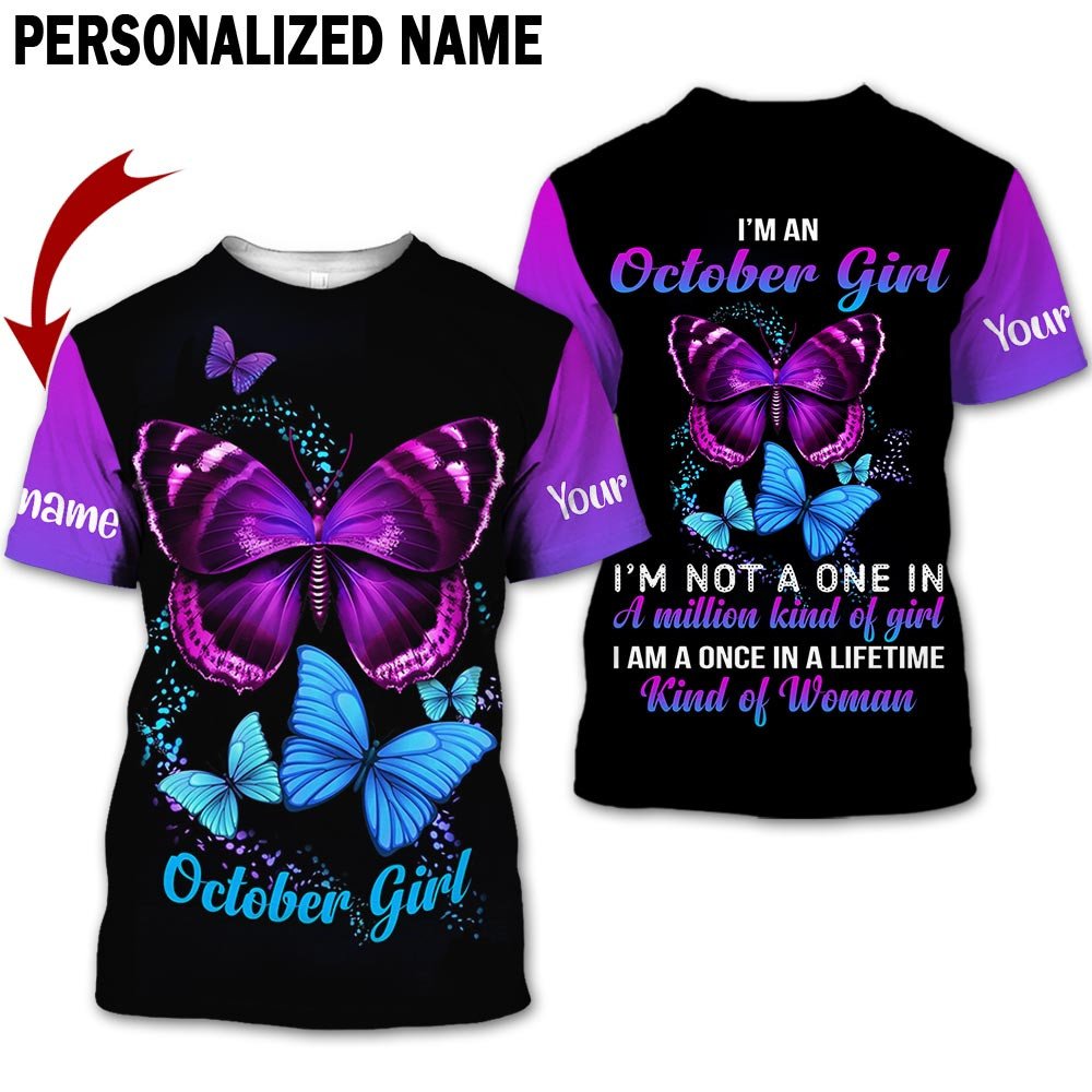 Presonalized Name Birthday Outfit October Girl 3D All Over Printed Bufterfly Purple And Blue Birthday Shirt TO2825