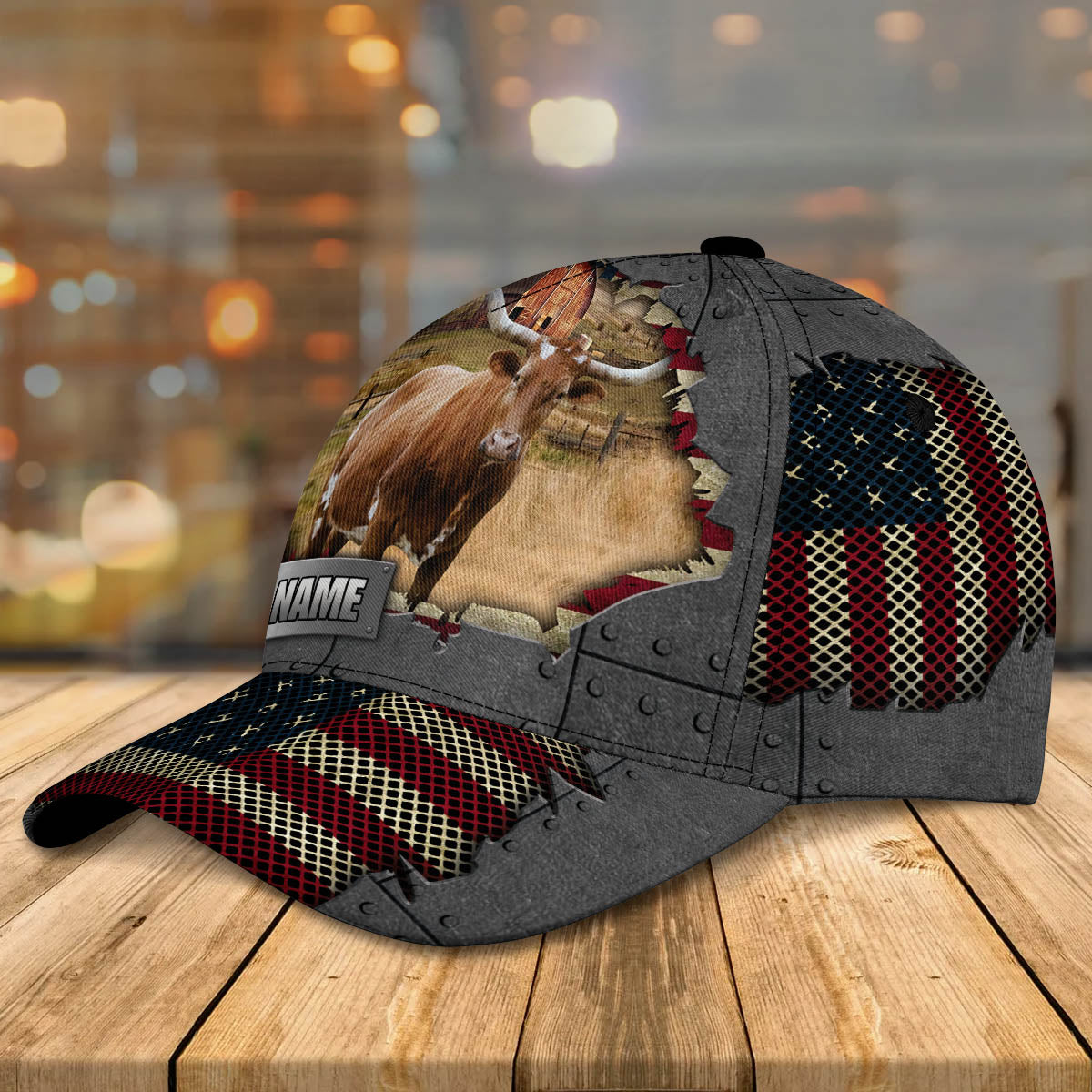 Texas Longhorn Customized Name Us Flag Net 3D Cap 3D All Over Print Baseball Cap, Cap For Farm Lovers, Animal Cap, Leather Pattern Cap CA3117