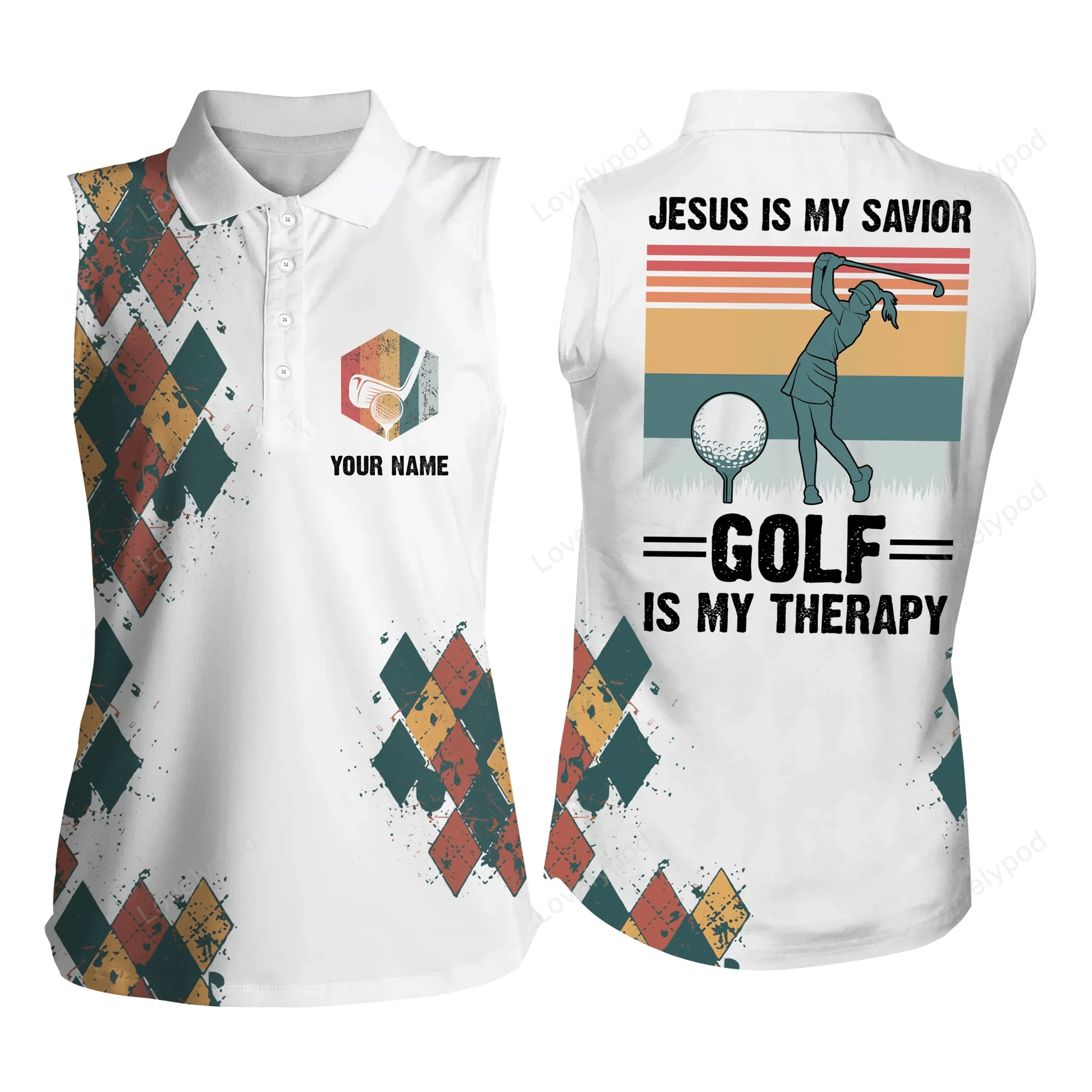 Women sleeveless polo shirt, jesus is my savior golf is my therapy custom name vintage ladies golf tops GY0221